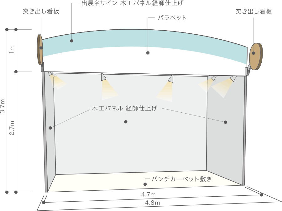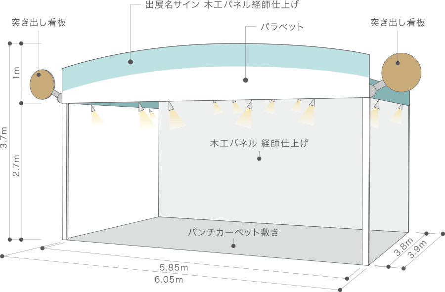 社名版、ブースNoパネル、木工壁面、カーペット、スポットライトが含まれ、指定色から壁紙やカーペットの色を選択いただけます。